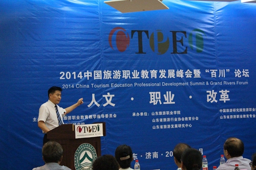 近日,2014年中国旅游职业教育发展峰会暨“百川论坛”(以下简称“峰会”)在山东旅游职业学院隆重召开。来自全国各地旅游院校、知名旅游企业的代表百余人汇聚山旅,共襄盛举。在上午的峰会开幕式上,学院院长宋德利致欢迎词,全国旅游职业教育教学指导委员会(以下简称“行指委”)秘书长韩玉灵代表行指委致辞祝贺,学院副院长魏凯主持了开幕式。简洁高效的开幕式后,在南京旅游职业学院院长周春林的主持下,与会的旅游教育界、企业界的学者、专家立即投入了热烈的学术研讨之中。