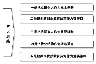 我们的基本考虑是以转变教育思想、更新教育观念为先导,以培养全体学生的社会责任感、创新精神、实践能力和创业意识为要义,以改革人才培养模式、课程体系、教学内容、教学方法和教学评价为重点,面向全体学生,结合专业教育,在人才培养的全过程融入创新创业教育理念、做法,以学生的创新创业素质、能力和成果来衡量高校本科教育质量,从而大力推动高校更加重视和做好创新创业教育工作,持续提高人才培养质量。