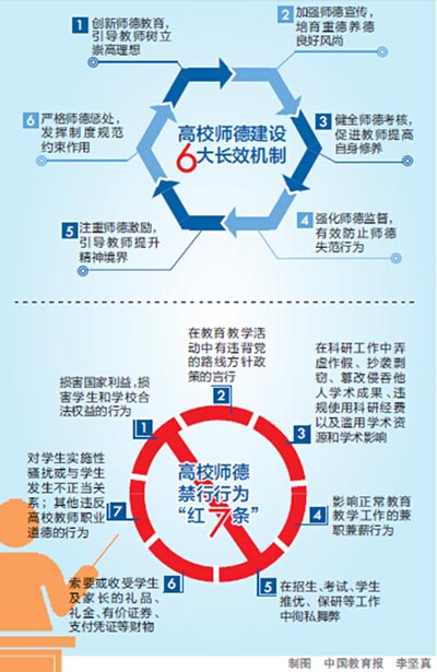 违反师德建设的惩处机制的主要内容有哪些?教师司负责人介绍说,《意见》划出对高校教师具有警示教育意义的师德禁行行为“红七条”:一是损害国家利益,损害学生和学校合法权益的行为;二是在教育教学活动中有违背党的路线方针政策的言行;三是在科研工作中弄虚作假、抄袭剽窃、篡改侵吞他人学术成果、违规使用科研经费以及滥用学术资源和学术影响;四是影响正常教育教学工作的兼职兼薪行为;五是在招生、考试、学生推优、保研等工作中徇私舞弊;六是索要或收受学生及家长的礼品、礼金、有价证券、支付凭证等财物;七是对学生实施性骚扰或与学生发生不正当关系,以及其他违反高校教师职业道德的行为。对高校教师有违反“红七条”情形的,将依法依规分别给予相应处分。同时,建立问责机制,对教师严重违反师德行为造成不良影响或严重后果的,追究高校主要负责人的责任。