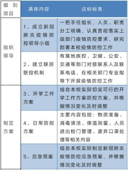 《达标细则》在组织领导、方案制定、制度建立、全员培训、物资保障、清洁消毒、隔离区域、建立台账、校园管理、教学准备等10个方面,细化分解为27项具体核验条件,每一项条件核验为“否”的,即视为“不合格”,经整改仍不到位的,不得安排开学。