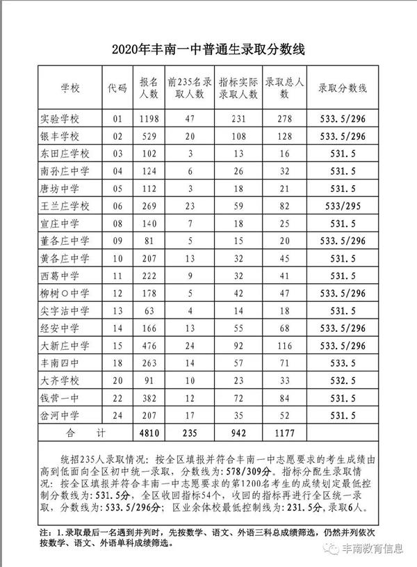 2020年丰南一中、惠丰高中录取分数线公布!