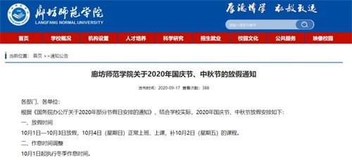 廊坊师范学院关于2020年国庆节、中秋节的放假通知↓↓↓
