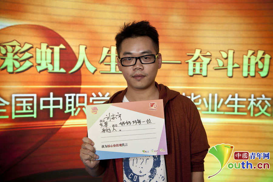 “彩虹人生——奋斗的青春最美丽”分享团成员,江门市新会区方块动漫科技有限公司经理刘志方写下自己的“价值观体”。