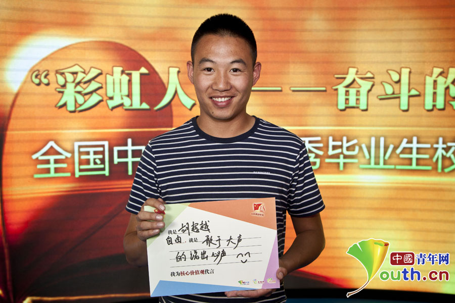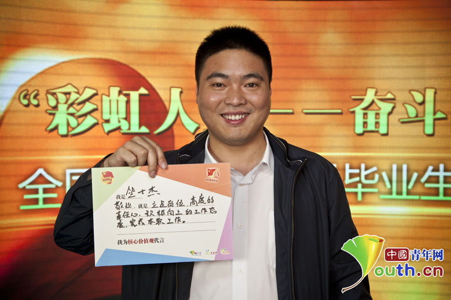 “彩虹人生——奋斗的青春最美丽”分享团成员,天津津利华酒店服务员裴娜写下自己的“价值观体”。