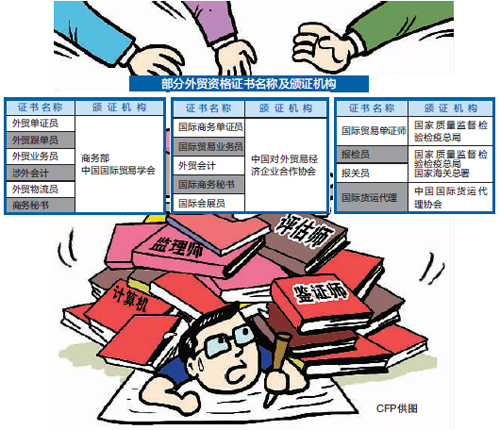 据记者粗略统计,目前,中国外贸证书的发放、制定机构有5家,分别是中国国际贸易学会、中国对外贸易经济企业合作协会、中国国际贸易促进委员会、中国国际货代协会、中国报关协会等。这些机构根据外贸岗位的细分状况,制定了种类繁多的外贸证书,几乎涵盖了外贸行业各个环节的所有岗位,各种职业资格证书累计多达20个。